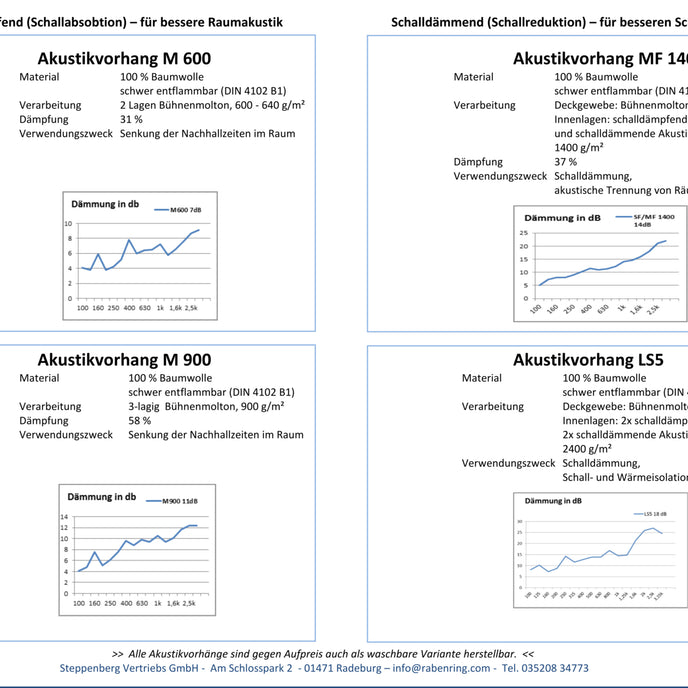 Der M600 kommt überall dort zum Einsatz, wo die Nachhallzeiten im Raum gesenkt werden sollen. Gerade in großen, leeren bzw. wenig möblierten Räumen kann sich das Echo extrem auswirken und so den Hörgenuss eines Musikstückes oder die Chorprobe zunichte machen. Jeder der schon einmal in einer leeren Wohnung gestanden hat kennt den akustischen Unterschied, wenn auf einmal wichtige Schallabsorber wie z.B. die Couch und der Teppich fehlen. Bestehend aus 2 Lagen schwerem Bühnenmolton bringt der M600 sogenannte weiche Masse mit in den Raum um dort die überschüssige Schallenergie in Wärmeenergie umzuwandeln und somit das Echo zu reduzieren.